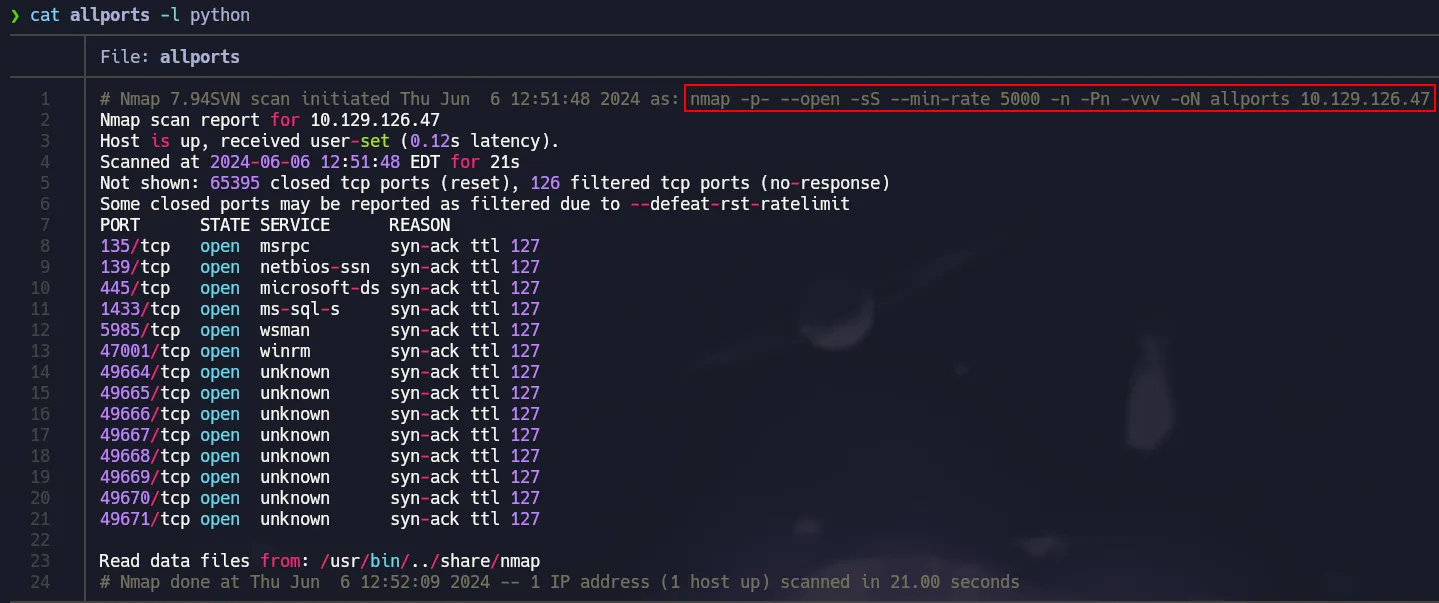 nmap -p- --open -sS --min-rate 5000 -n -Pn -vvv 10.129.126.47 -oN allports