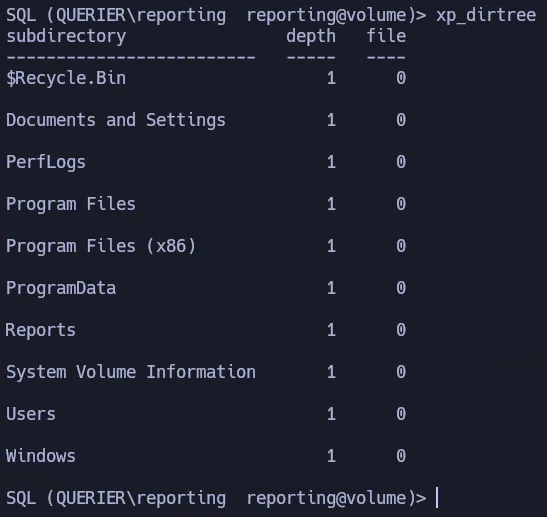 Since don’t have permission to run or enable xp_cmdshell, we can attempt to get the hash of the user running the SQL service. To do that we can use xp_dirtree which allows to list all the resources of a certain directory or path.