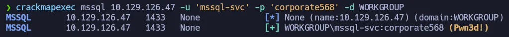 crackmapexec mssql 10.129.126.47 -u 'mssql-svc' -p 'corporate568' -d WORKGROUP