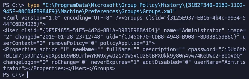 type "C:\ProgramData\Microsoft\Group Policy\History\{31B2F340-016D-11D2-945F-00C04FB984F9}\Machine\Preferences\Groups\Groups.xml"