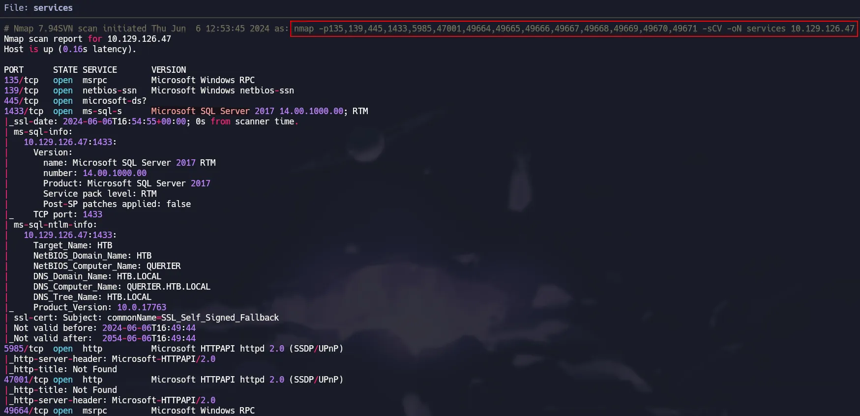 nmap -p135,139,445,1433,5985,47001,49664,49665,49666,49667,49668,49669,49670,49671 -sCV 10.129.126.47 -oN services