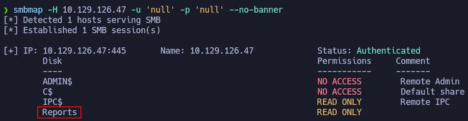 smbmap -H 10.129.126.47 -u 'null' -p 'null' -r 'Reports' --no-banner