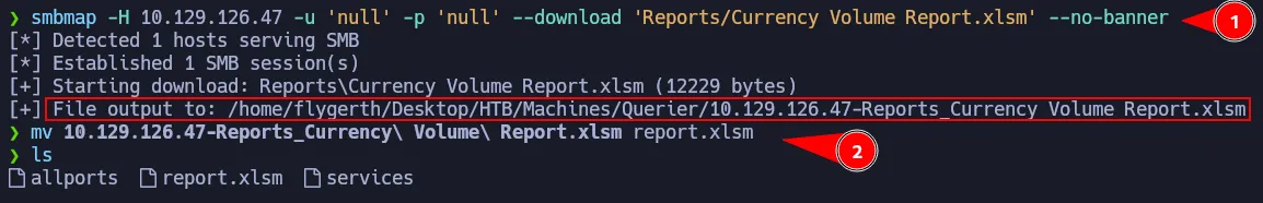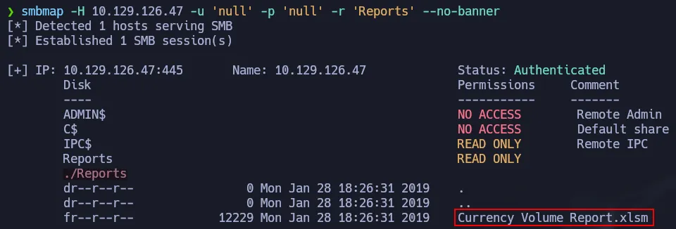 smbmap -H 10.129.126.47 -u 'null' -p 'null' --download 'Reports/Currency Volume Report.xlsm' --no-banner