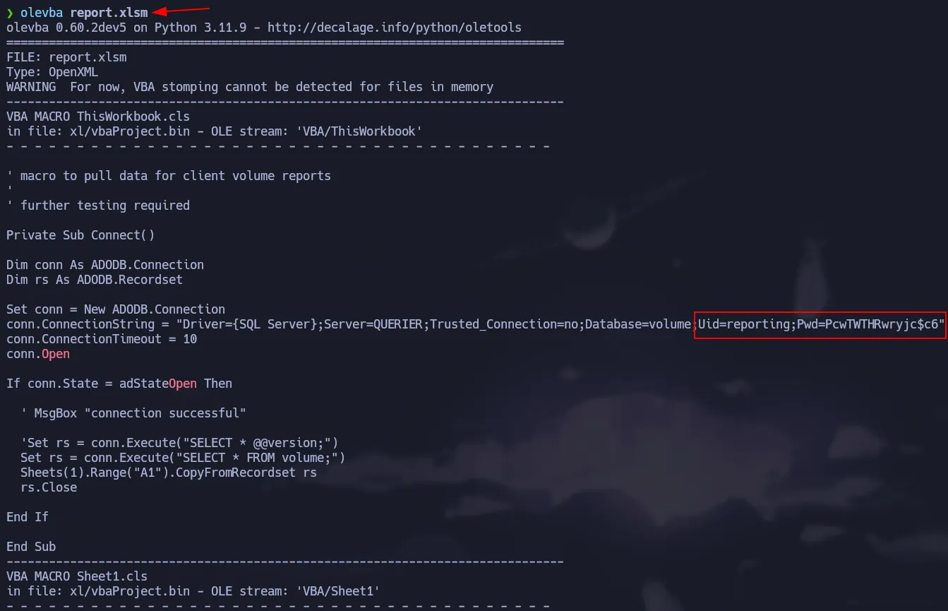 It dumps all the content of the macro from reporting.xlsm and there is a credential that we can check if it’s valid using crackmapexec. Since Port 1433 is open, we can also check if the credential is valid for Microsoft SQL Server service.