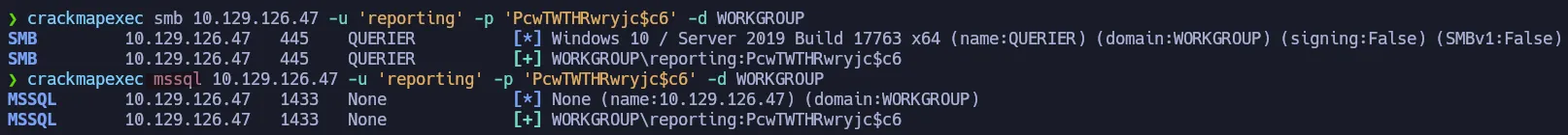 crackmapexec mssql 10.129.126.47 -u 'reporting' -p 'PcwTWTHRwryjc$c6' -d WORKGROUP