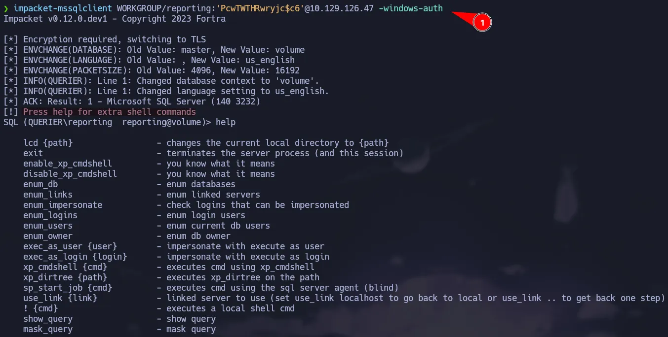 impacket-mssqlclient WORKGROUP/reporting:'PcwTWTHRwryjc$c6'@10.129.126.47 -windows-auth